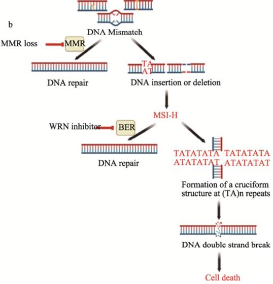 微卫星也称为短串联重复或简单序列重复,由1-6个核苷酸的重复序列组成,约占基因组的3%。DNA错配修复(MMR)系统广泛存在于原核生物与真核生物中,是细胞进化中高度保守的DNA修复机制,对维持基因组的完整性和稳定性至关重要。由于肿瘤细胞内MMR系统存在缺陷,基因组容易发生重复序列的插入或缺失突变,导致微卫星序列复制错误大量积累,从而产生微卫星高度不稳定性(MSI-H)状态。MSI-H为肿瘤细胞较为独特的现象,可以导致肿瘤细胞基因组进一步紊乱和突变,从而促进恶性肿瘤的发生发展,是公认的重要致癌途径之一。MSI-H在子宫内膜癌、胃癌、结直肠癌等多种癌种中普遍存在,发生率约为11~27%,该类患者往往对传统化疗类药物反应较差,除免疫治疗外,临床仍亟需新的治疗方式。
